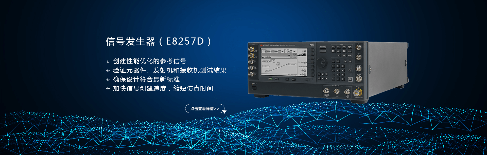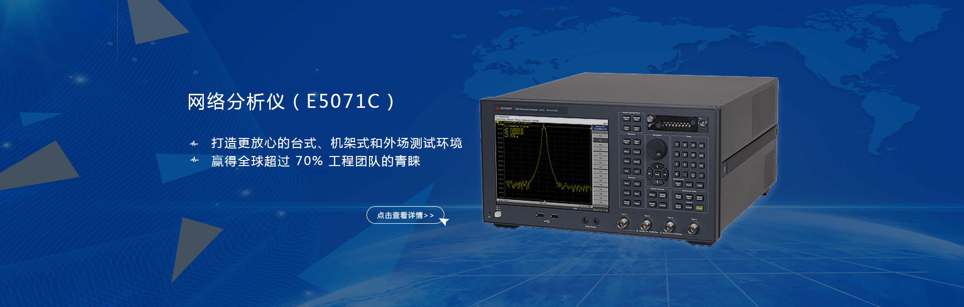 主要產(chǎn)品有:頻譜分析儀,網(wǎng)絡(luò)分析儀,綜合測試儀,藍牙wifi測試儀,噪聲系數(shù)測試儀,接收機,電話測試儀,高、低頻信號源,音、視頻信號分析儀,高精度萬用表, LCR/ 電橋、各種通信電源等。經(jīng)營的儀器品牌主要有:Keysight/Agilent (惠普 / 安捷倫)、 R/S (羅德 & 施瓦茨)、 Anritsu (安立)、Litepoint、 FLUK( 福祿克 ) 、 TEK (泰克)等。